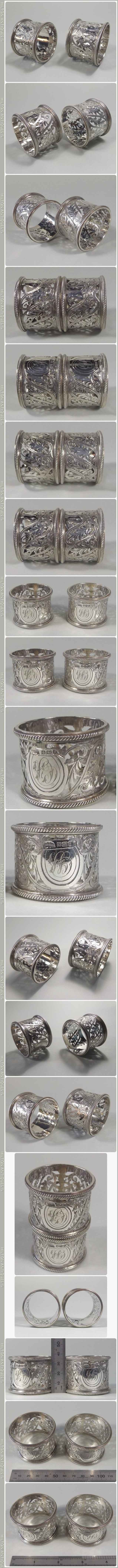 A pair of quality antique English sterling silver pierced Napkin Rings by Walker and Hall Sheffield 1893-4. The body is decorated with finely engraved foliage and scrollwork, the rims with heavier rope style ornamentation and initialled script within a horseshoe style cartouche. Both Napkin Rings are clearly Hallmarked with the Walker and Hall makers mark and corresponding date stamps. In vg condition. Approx 5cm w x 4cm h and 87gm the pair.