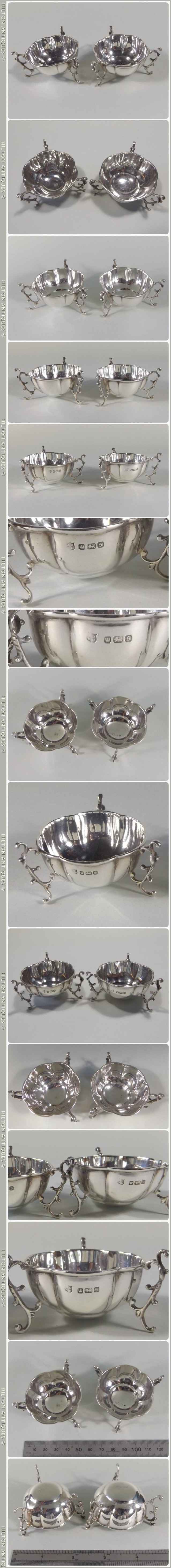 A pair of antique GEO.V English sterling silver lobed tri footed salts by James Deakin and Son Sheffield 19010-11. Each clearly hallmarked, some minor interior spotting and expected wear, both in generally good condition. Approx 5cm w (bowl) x 3cm h and 44gm the pair.