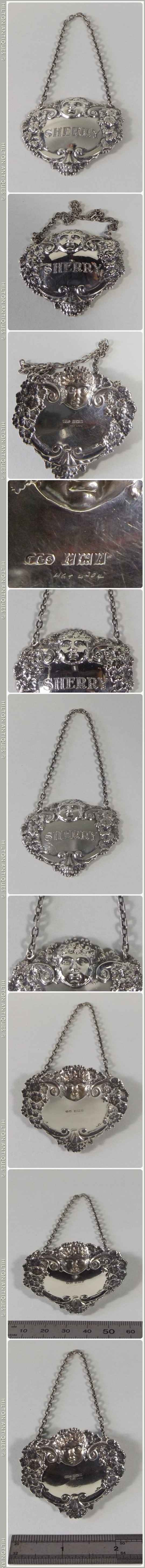 An English sterling silver Sherry Decanter label and chain decorated with embossed floral borders, a shell to base and "SHERRY" stylishly engraved to the central cartouche below a Cherub face on a slightly domed base. Maker T & S Birmingham 1966-7 (Turner & Simpson). A few very small previous owner scribed details just below the Hall Marks to rear of label else in good condition. Approx 6cm l x 5cm w and 18gm.