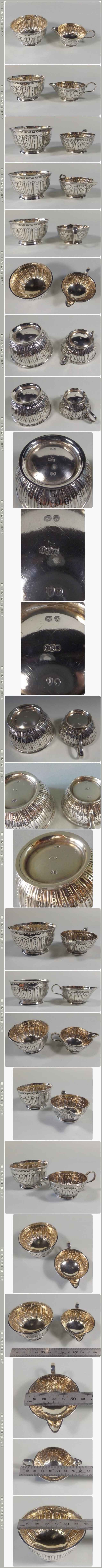 An antique English sterling silver - gilt bachelor Sugar and Creamer London 1885-6 and 1884-5 by JSB of London A good solid small set with gilt wash to interior (some gilt wear) hall marks to base, one with a few light previous owner number/letters added to the base else both pieces are in good condition. Sugar approx 7cm w at top of bowl x 4cm h and 58.8gm the Creamer 5.5cm w x 3cm h and 42.8gm