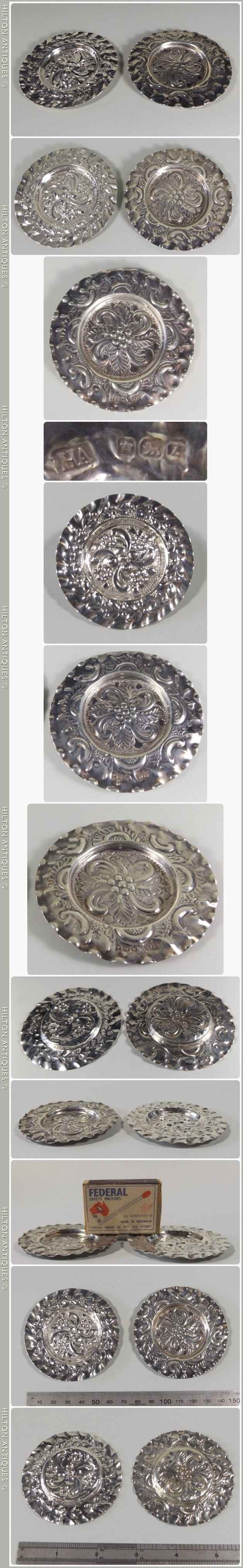 Two small antique English sterling silver Pin Dishes HA Sheffield 1892-3 and 1900-01. Both are decorated with embossed floral's in a shallow saucer form. Some scratches are evident around a portion of one dish edge plus light handling wear otherwise both are in good condition. Approx 7cm w x .5cm h and 33gm the pair.