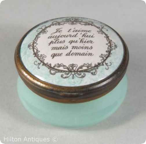 A rounded shape Halcyon Days Enamels box, the lid decorated with a French quotation "I love you - more today than yesterday but less than tomorrow" within a cream reserve and mottled green border and green base with a bronzed hinged mounts and earlier Bilston and Battersea backstamp to the base. In good condition approx 4.4cm w x 2.7cm h. C 1970-79.