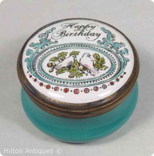 Bilston and Battersea 20th C revival box Happy Birthday Doves C 1970s