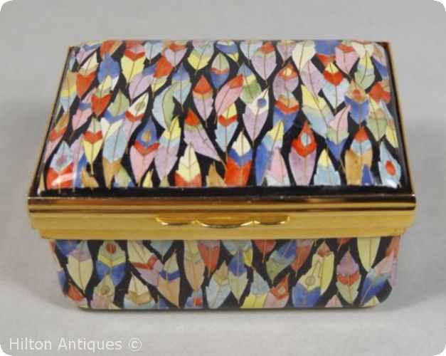 A rectangular shaped Halcyon Days Enamels box with a hinged lid and gilt mounts, the lid and sides decorated with a profusion of finely rendered colourful feathers. The interior decorated with single feather on a cream base.