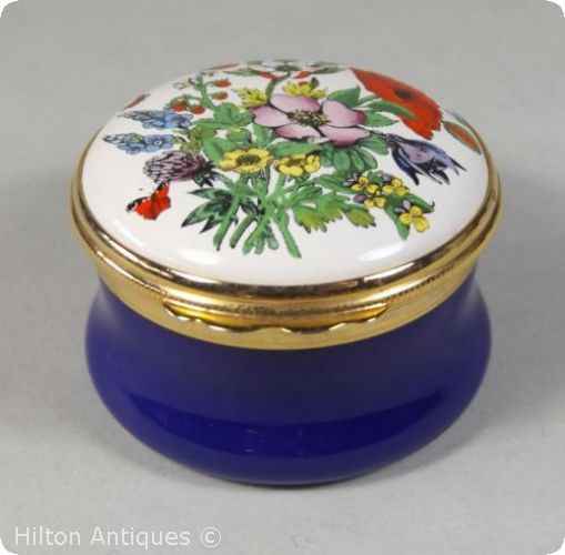 A round shape Halcyon Days Enamels box decorated with a mass of floral's and small butterflies on the white gilt hinged lid, the rich royal blue base includes the 1980- backstamp, the white interior decorated with a simple monochrome flower and butterfly. This box is in good condition and comes with original Halcyon Days packaging box. Approx 4.3cm w x 3.9cm h.