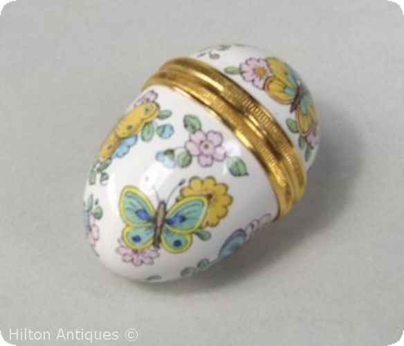 A small egg shaped Halcyon Days Enamels box, the screw on-off lid and base decorated with Butterflies and floral's on a white ground, the interior marked with the 1980- backstamp, the mounts gilt. This small egg box is in good condition. No packaging box, egg only. Approx 3.2cm h x 2.4cm w.