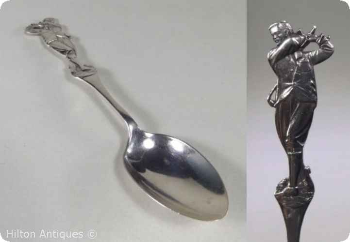 A good antique English sterling silver figural ended spoon by H.Matthews Birmingham 1912-13 decorated with a swinging golfer in a well detailed - modeled and realistic 3D manner. In good condition. Illusive item. Approx 12.5cm l and 19gm.