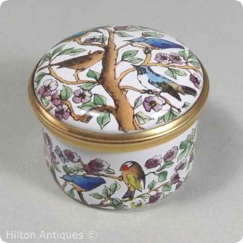 A small round shape Halcyon Days Enamels box, the gilt screw on-off lid decorated with four songbirds perched in a tree, the side continuously decorated with smaller birds amongst foliage. The base is marked with the Halcyon Days 1980- backstamp and the cream/white interior with a simple black and white songbird. In good condition including original box and HD brochure. Approx 3.2cm w x 2.4cm h