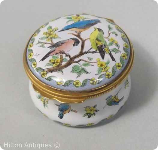 A rounded shape Halcyon Days Enamels box, the gilt mounted hinged lid decorated with three songbirds perched in a tree, the side continuously decorated with smaller birds and single flowers above a mottled blue base border and narrow continuous flower with leaf decoration. The base is marked with the Halcyon Days 1980- backstamp and the cream/white interior with a simple black and white reserve and words Siskin Bullfinch Nuthatch. In good condition approx 4.3cm x 2.8cm h