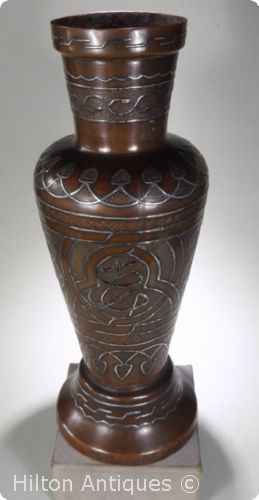 An Antique 19th C to early 20th C Cairoware Copper & Silver vase decorated with various silver bordered panels, including script and textured infill segments using traditioal punches and graving tools. The vase has some narrow vertical scratches down both sides which may have been added during the manufacturing of the vase as the original patina appears to cover them. Considering age this vase is good condition, the interior has not been touched and shows dust and vertigree consistant with age. The exterior patina wear is fairly light with the rich brown/copper tone highlighting the silver borders. Some surface sections of the silver borders have tarnished and has been left as is to protect the existing patina. Approx 28cm h x 10.7 cm at shoulder, 10.5cm to base and 7.5cm ot top. Net weight approx 812gm