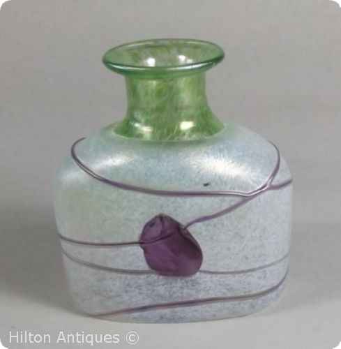 A small hand made Kosta Boda art glass vase by designer Bertil Vallien decorated with a tranlucent mottled green waisted neck, a frosted white base and overlay abstract purple elements with original label intact, the base engraved, numbered and signed B. Vallien. VG vintage condition, no chips, cracks, or repairs. Circa 1980s