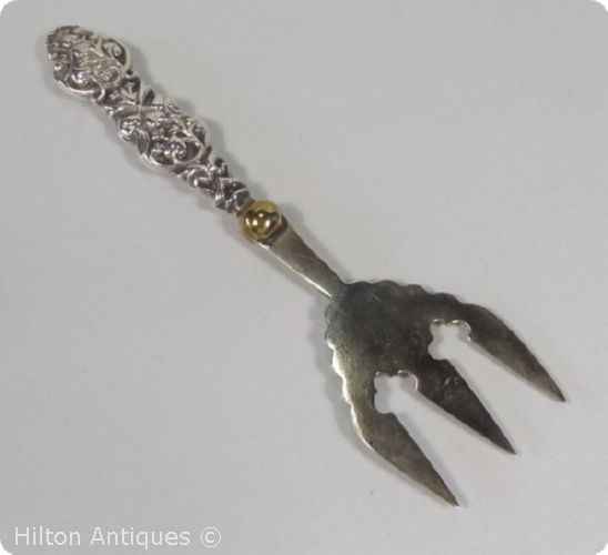 An English antique sterling silver handled and EP Cake Fork Birmingham 1907-8 decorated with an attracive floral embossed loaded sterling handle with a brass ball joiner soldered to an EPNS fork. Good condition with general scuffing and handling wear in keeping with age and use. Approx 14cm and 22gm.