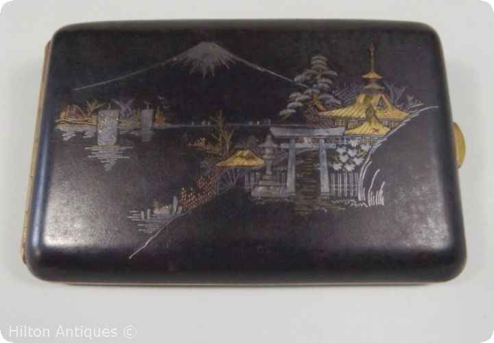A vintage Japanese Damascene Cigarette Case decorated with Mt Fuji, Tori, lantern, water wheel, sailing boats and Pine tree in gold and silver on a black matt ground. The hinged case revealing a plain black interior ground with 2 gold plate spring retainers. The case is slightly curved with rounded corners, the overall condition is good+ with minor scuffing and plate wear consistent with light use only. The catch and hinge are also VG. Case is marked K24 to rear. Approx 12cm l x 8cm w x 1.8cm h and 104gm.