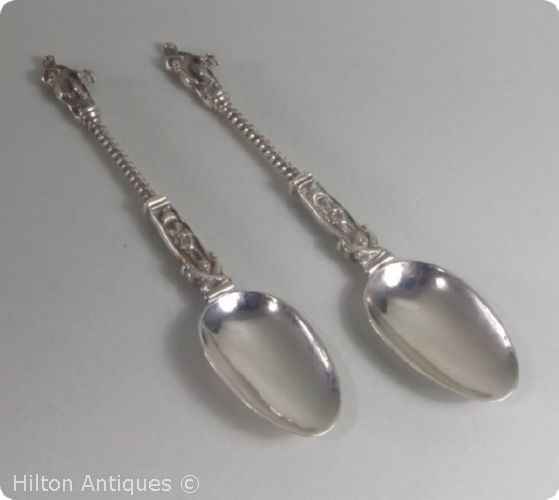 Two antique Dutch solid silver Apostle spoons modelled with three dimensional figural ends above a twisted wire handle supported by a solid rectangular section with a figure to front and rear, the bowl stamped with "BI" the other similar spoon with a single flower style mark and a possible "R" within. Both spoons also contain the Dutch silver standard sword mark. Condition VG no repairs, good solid spoons. Approx 12.6cm l and 37.2gm (2) spoons. Circa 19th C.