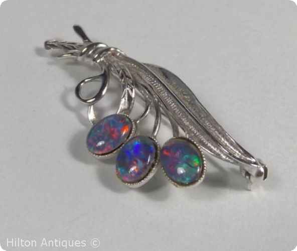 An Australian opal and sterling silver brooch modeled in a naturalistic manner depicting slender eucalypt-native leaves gathered with three triplet opal buds, the rear with a standard pin and rotating retainer and the STG SIL marks. There's also a small "O" ring for a safety chain or to wear as a pendant if preferred. In vg condition approx 5cm l x 2cm w and 6gm
