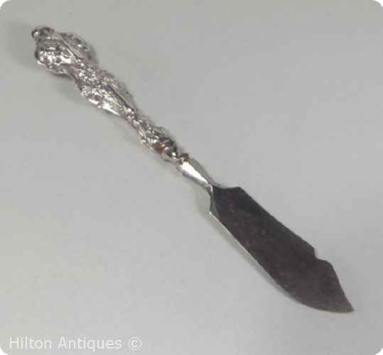 An antique English sterling silver Butter or Pate Knife Birm 1904-5 decorated with a floral embossed sterling silver filled handle and plated steel blade. Some steel plating wear and handling wear commensurate with age and use, generally good condition. Approx 15cm l and 22gm.