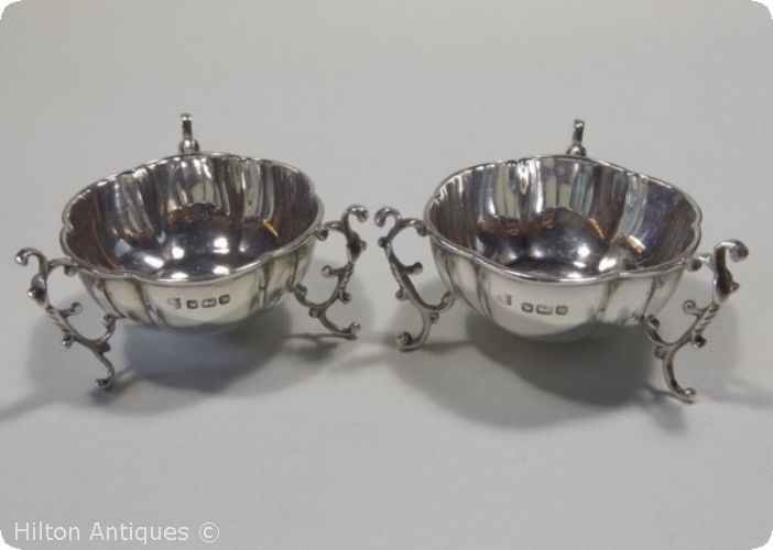 A pair of antique GEO.V English sterling silver lobed tri footed salts by James Deakin and Son Sheffield 19010-11. Each clearly hallmarked, some minor interior spotting and expected wear, both in generally good condition. Approx 5cm w (bowl) x 3cm h and 44gm the pair.