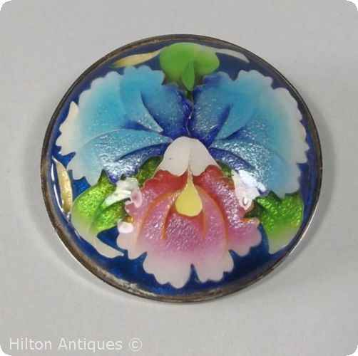 Vintage Japanese Cloisonne round Brooch translucent florals and silver wire