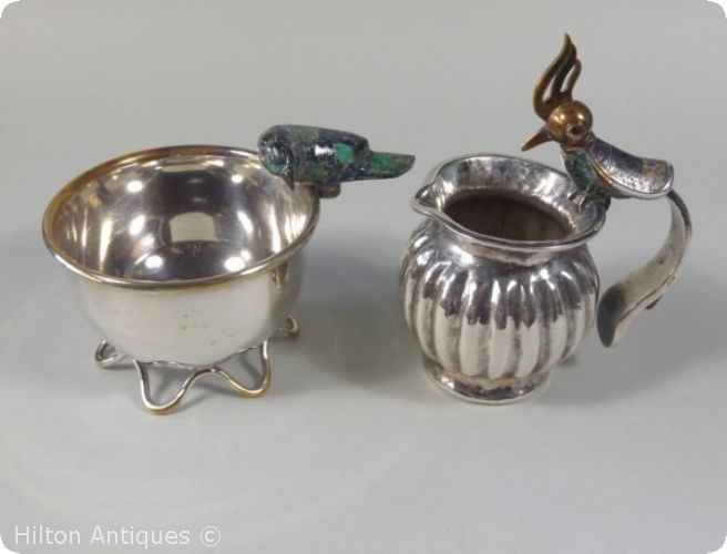 A vintage hand crafted Los Castillo mosaic electroplated Creamer and Sugar bowl. The sugar bowl is decorated with a single songbird which is covered with turquoise mosaic and shell eyes, the plain domed bowl sitting on a wavy wire support/base and the Los Castillo Taxco marks stamped below. The creamer is formed with a distinctive ribbed body also in silver plate, the handle decorated in the form of a long tailed pheasant perched on the top edge with a gold tone head and crest, a turquoise mosaic body and back of tail. The creamers base is signed Los Castillo, Hecho EN Mexico, Platendo 207.