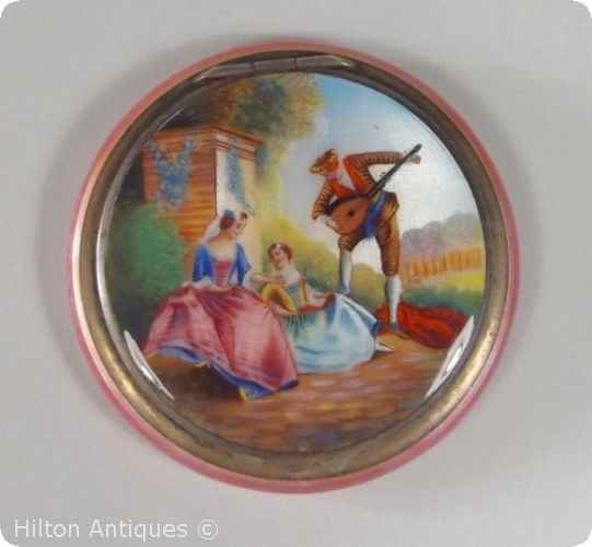 A Vintage continental enamelled powder compact, the lid fiinely decorated and rendered in various enamel colours with a figural and landscape scene depicting a musican and two elegantly attired woman dancing to the rendition in a rural outlook. The silver base enamelled in a brilliant translucent pink hue accentuated by the guilloche silver. The lid is hinged with gilt mounts and mirror, the gilt metal interior includes a rotating lid for the powder compartment below the puff. The interior is marked with Metal, the compact mount with an unknown makers or Town mark plus the 835 silver mark. Most likely Austrian or Germany around 1910-20.